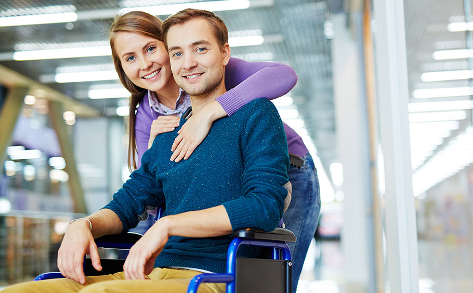 Portrait of young happy couple: pretty girl hugging her smiling handicapped boyfriend in wheelchair